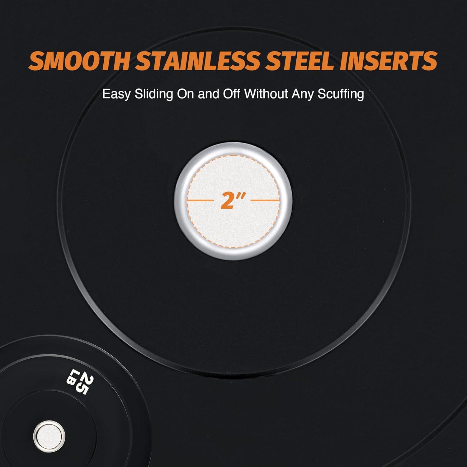 Standard 2-inch Inserts: With 2-inch stainless steel inserts, our 17.7″ weight plates effortlessly fit onto standard Olympic barbells, allowing for easy loading and unloading without causing wear to either the bumper plates or the bars.